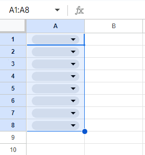 To autofill a drop down list in Google Sheets, select the cells with the dropdown, then click and drag the small circle at the bottom right corner of the selection.